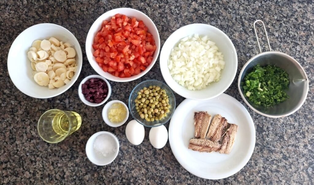 - 1. Pique bem a cebola, o tomate, a salsa, a cebolinha, o palmito, a sardinha e a azeitona;